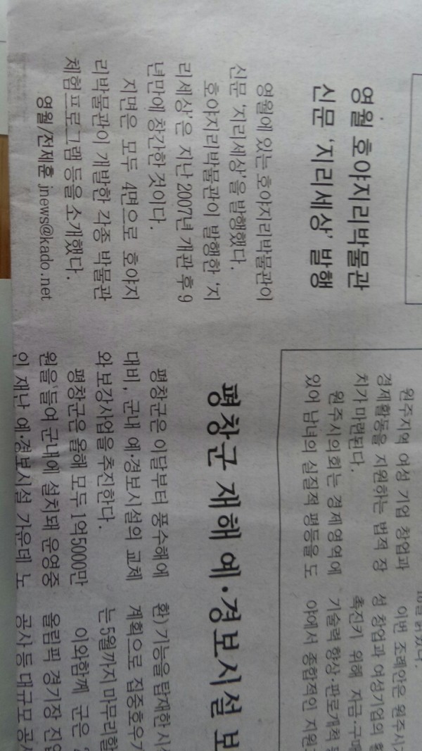 2016.03.19일 강원일보 5면 영월 호야지리박물관 '지리세상' 신문 발행