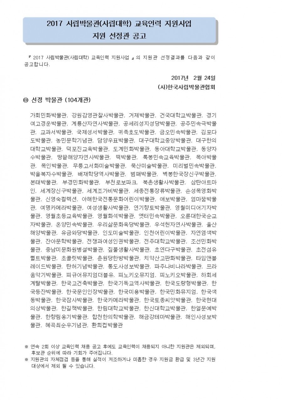 2017 사립박물관(사립대학) 교육인력 지원사업 지원 선정관 공고 페이지 정보 작성자 관리자 작성일17-02-24 19:58 조회42,061회 댓글0건 관련링크 이전글 다음글 목록 본문 댓글목록 등록된 댓글이 없습니다. 이전글 다음글 목록
