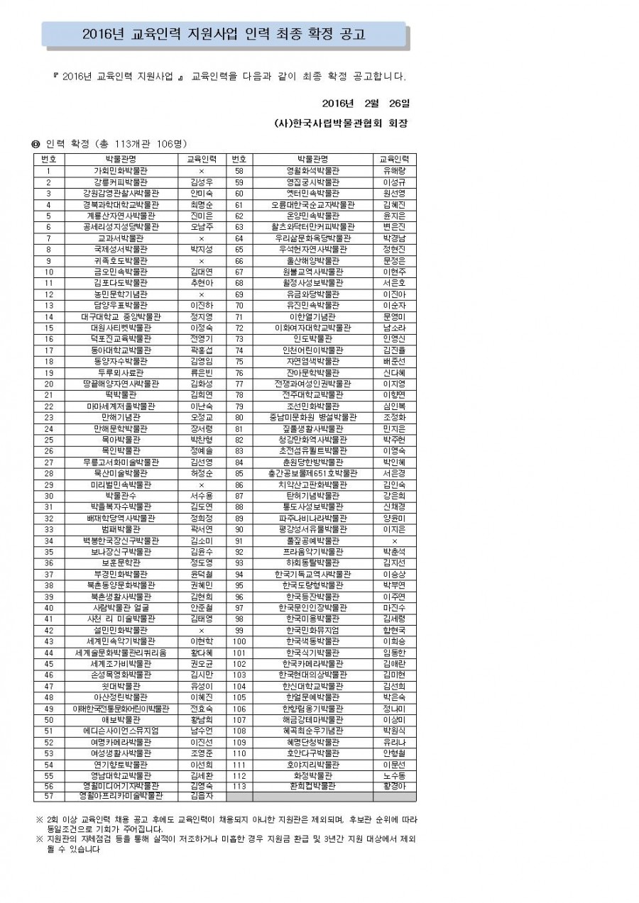 2016년 교육인력 지원사업 인력 최종 확정 공고 페이지 정보 작성자 관리자 작성일16-02-26 19:54 조회43,031회 댓글0건 관련링크 이전글 다음글 목록 본문 댓글목록 등록된 댓글이 없습니다. 이전글 다음글 목록