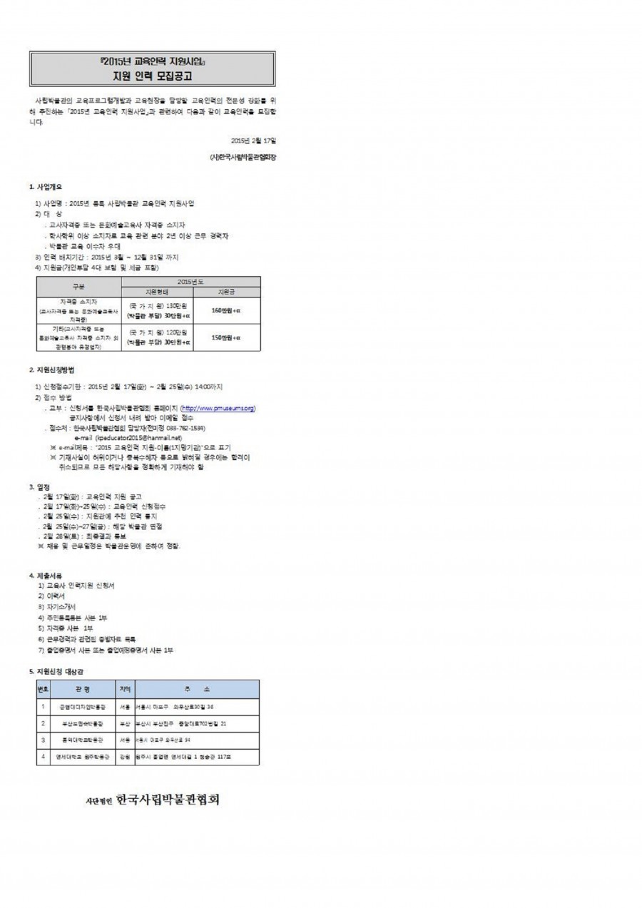 2015 교육인력 지원사업 지원인력 모집공고(3차) 페이지 정보 작성자 관리자 작성일15-03-13 15:15 조회41,511회 댓글0건 관련링크 이전글 다음글 목록 본문 이메일 : master@domain.com 댓글목록 등록된 댓글이 없습니다. 이전글 다음글 목록
