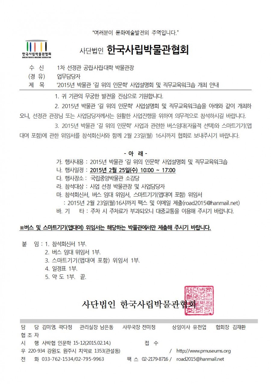 2015 박물관 ‘길 위의 인문학’ 사업설명회 및 직무교육워크숍 개최 안내 페이지 정보 작성자 관리자 작성일15-02-25 15:16 조회41,693회 댓글0건 관련링크 이전글 다음글 목록 본문 댓글목록 등록된 댓글이 없습니다. 이전글 다음글 목록