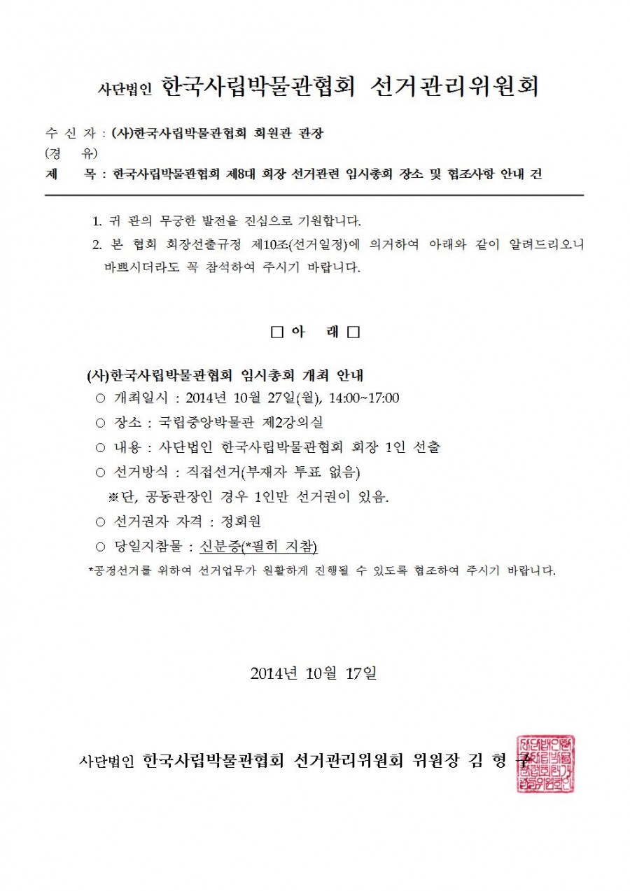 한국사립박물관협회 제8대 회장 선거관련 임시총회 장소 및 협조사항 안내 건