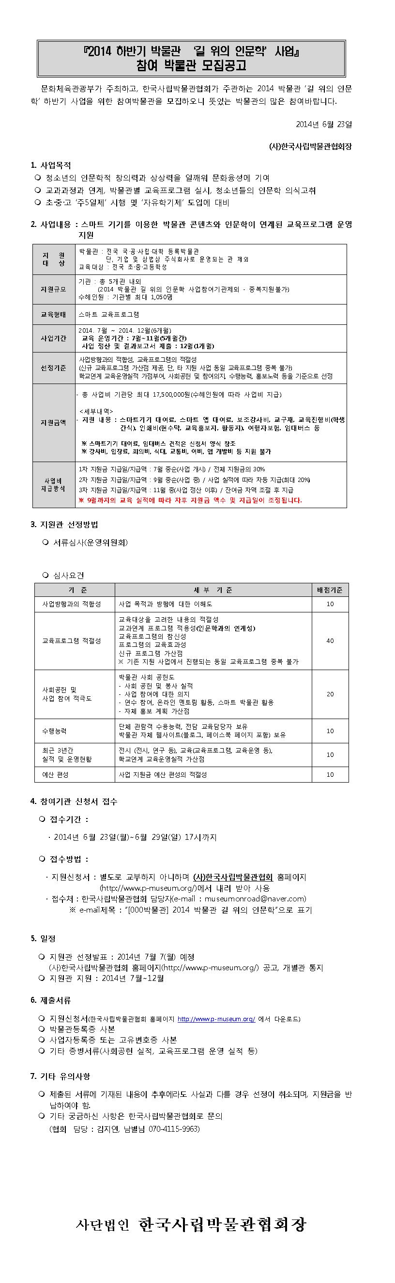 [인문학] 『2014 박물관 ‘길 위의 인문학’사업』참여 박물관 추가 모집공고 페이지 정보 작성자 관리자 작성일14-06-23 14:27 조회41,084회 댓글0건 관련링크 이전글 다음글 목록 본문 댓글목록 등록된 댓글이 없습니다. 이전글 다음글 목록