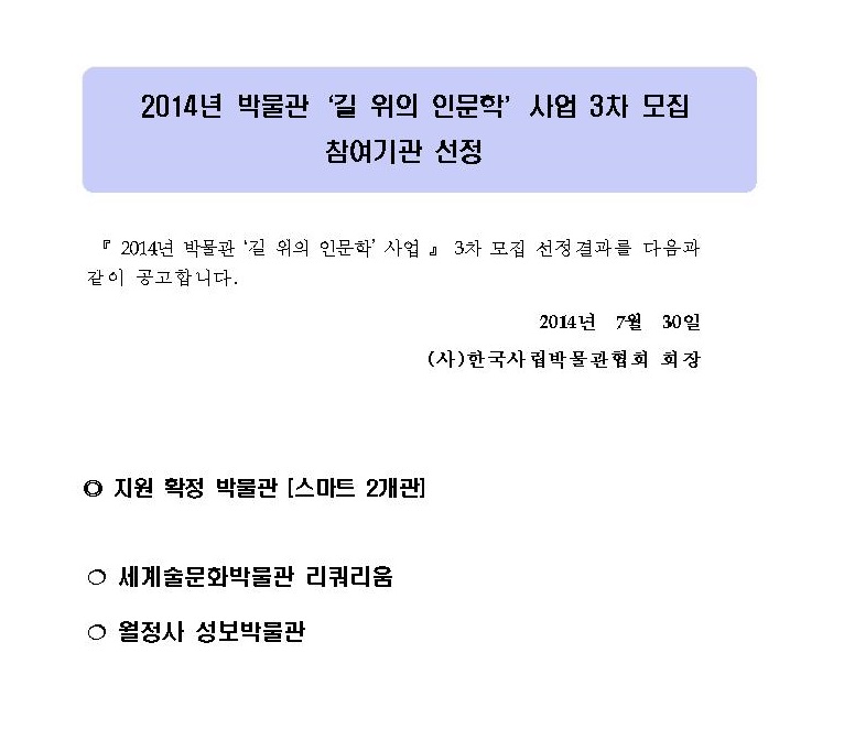 [인문학] 2014 박물관 길 위의 인문학 3차 기관모집 선정결과발표 페이지 정보 작성자 관리자 작성일14-07-30 14:31 조회39,392회 댓글0건 관련링크 이전글 다음글 목록 본문 댓글목록 등록된 댓글이 없습니다. 이전글 다음글 목록