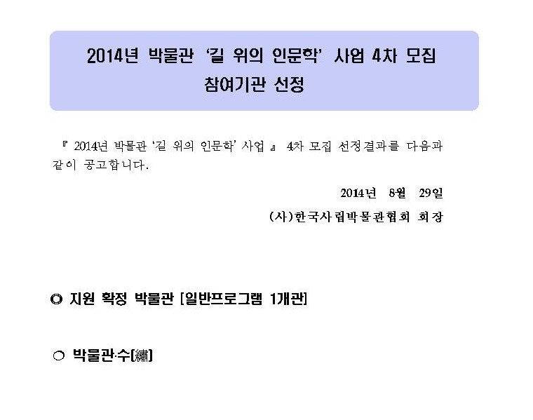 2014 박물관 길 위의 인문학 4차 기관모집 선정결과발표 페이지 정보 작성자 관리자 작성일14-08-29 14:33 조회40,187회 댓글0건 관련링크 이전글 다음글 목록 본문 댓글목록 등록된 댓글이 없습니다. 이전글 다음글 목록