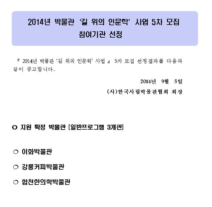 2014 박물관 길 위의 인문학 5차 기관모집 선정결과발표 페이지 정보 작성자 관리자 작성일14-09-05 14:34 조회40,492회 댓글0건 관련링크 이전글 다음글 목록 본문 댓글목록 등록된 댓글이 없습니다. 이전글 다음글 목록
