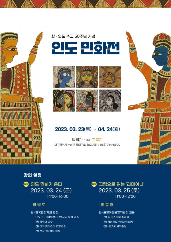 [박물관 수] 인도민화전 개최 페이지 정보 작성자 관리자 작성일23-04-13 09:22 조회15,226회 댓글0건 관련링크 이전글 다음글 목록 본문 박물관 수(관장 이경숙, 대구시 수성구 국제보상로 186길 47)에서 "한국. 인도 수교 50주년 기념 - 인도민화전"을 개최합니다.많은 관심과 참여를 부탁드립니다. 댓글목록 등록된 댓글이 없습니다. 이전글 다음글 목록